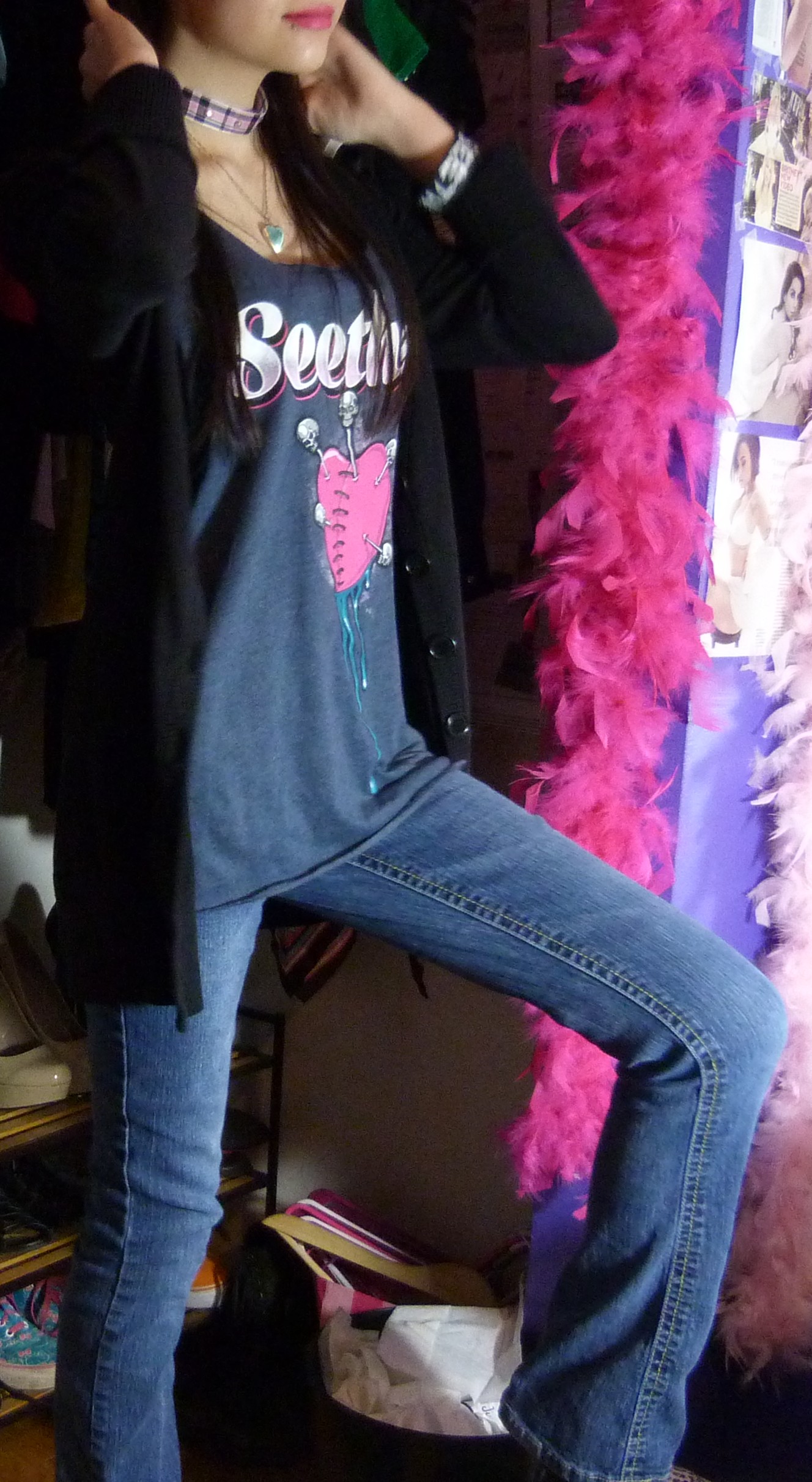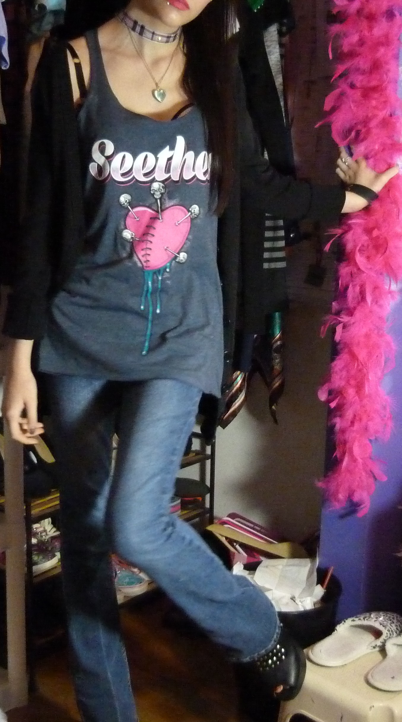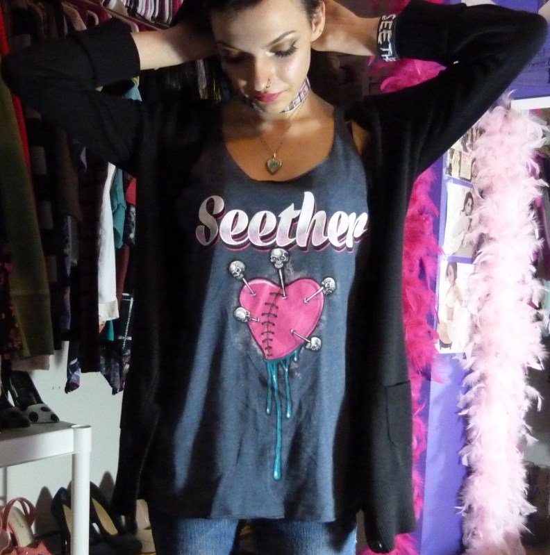 In 2015, December (on the 29th), Seether had listed a bundle of mystery shirts on their official site for sale! I had already bought this one, their LE one from a couple months before that year, but I also really wanted to get a couple of those mystery shirts! It was only $19.99 after a $5 discount that I had (originally $24.99) plus $4.99 shipping, for a total of $24.98 total! For the two shirts they got to pick out for me, plus a wristband and a piece of fake plastic shit. (They said “plus free shit”!) That was a pretty awesome deal. The two shirts they picked out for me were this one, a cool black one with a graphic, and this tank top I pictured below. I ended up doing a two part of photoshoots for outfits for both shirts a month later, in January of 2016. The other photoshoot might have turned out better, but I still got some pics for this photoshoot! Maybe one day I’ll re-do a photoshoot for this shirt, but for now here’s the original shoot I did for this one in 2016. You can also check out my original Shop For Days blog post (Seether Mystery Bundle) that I did for these two shoots, that post is why I even did the photoshoots to begin with! Let’s check out the photoshoot I did from back in the day.