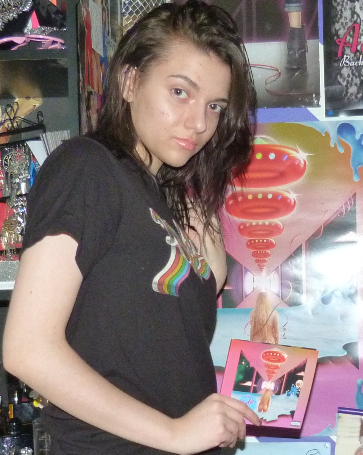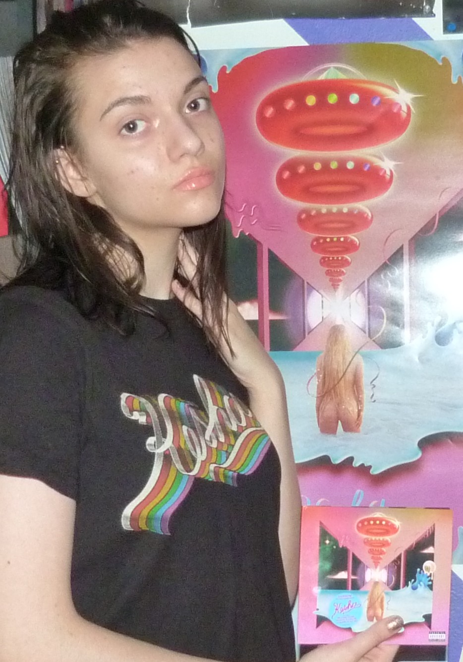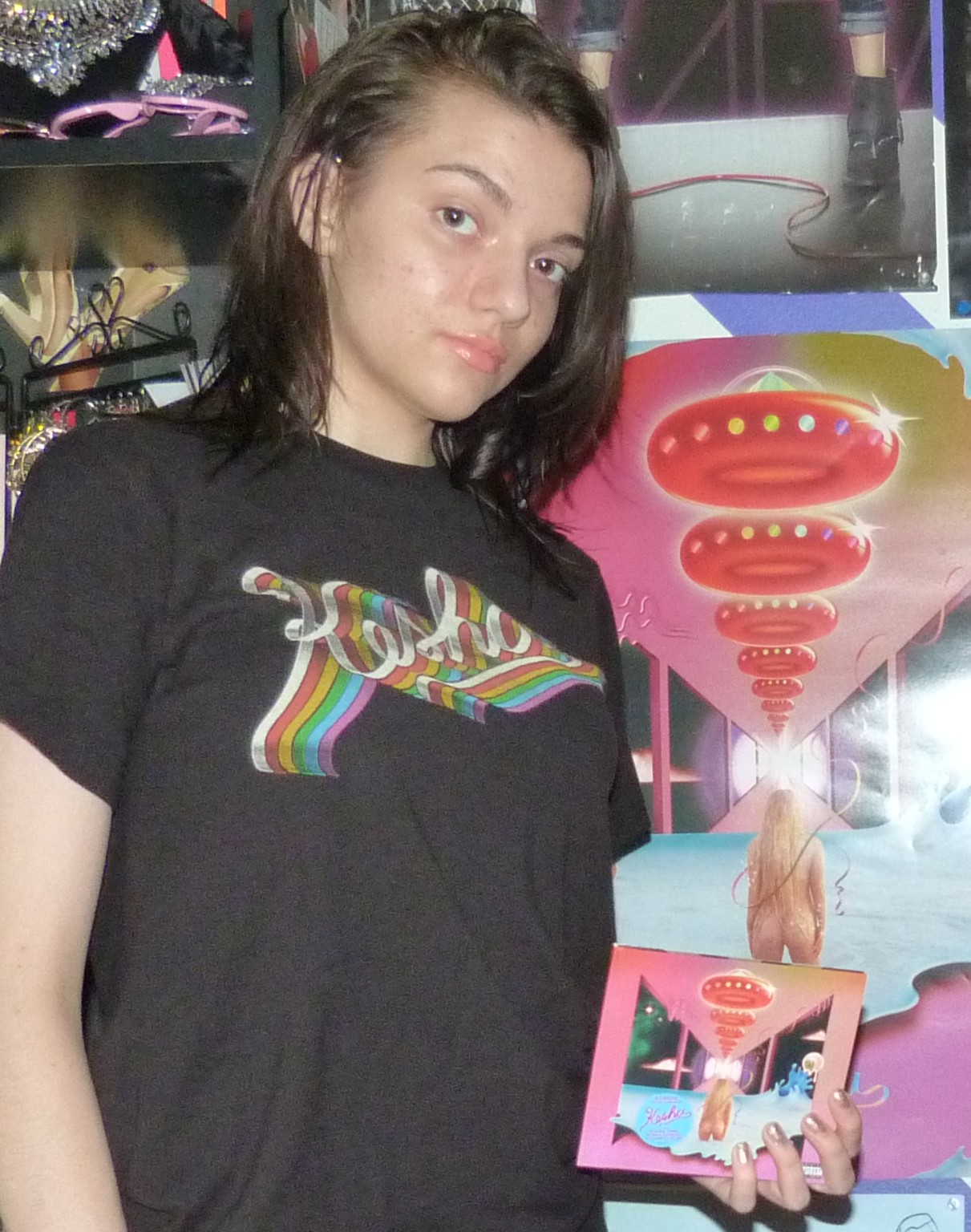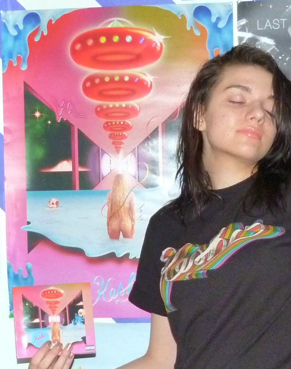 Rainbow was a big album for me in 2017, I really loved Kesha a lot after it dropped! I ended up getting a lot of merchandise for the album & even more once I saw her the month after this photoshoot and everything. Such a great album to me, I really loved it! This blog post is about this pre-order bundle I got in 2017 for a size small t-shirt, CD and poster for the album release. I did a photoshoot with all three things. I usually don’t post about CDs on here but I will sometimes post about album bundles because I used to usually shoot them all together! You can checkout the original Shop For Days blog post here, it’s called Kesha’s Spaceship and it features two photoshoots including this one. I love the poster and album cover with all my heart as well!