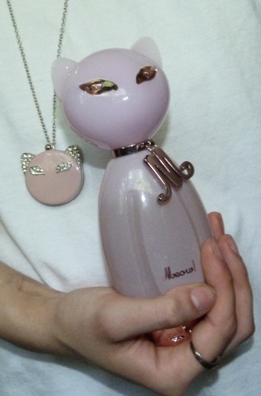 - I received the Meow perfume gift set duo of the full-sized perfume spray & solid perfume necklace on Christmas of December 25th, 2011 and even still have this original pic that I took of the set still boxed that day, because this was the day I very first ever got the camera I still use for all my shoots to this day. From my dad. 🙂