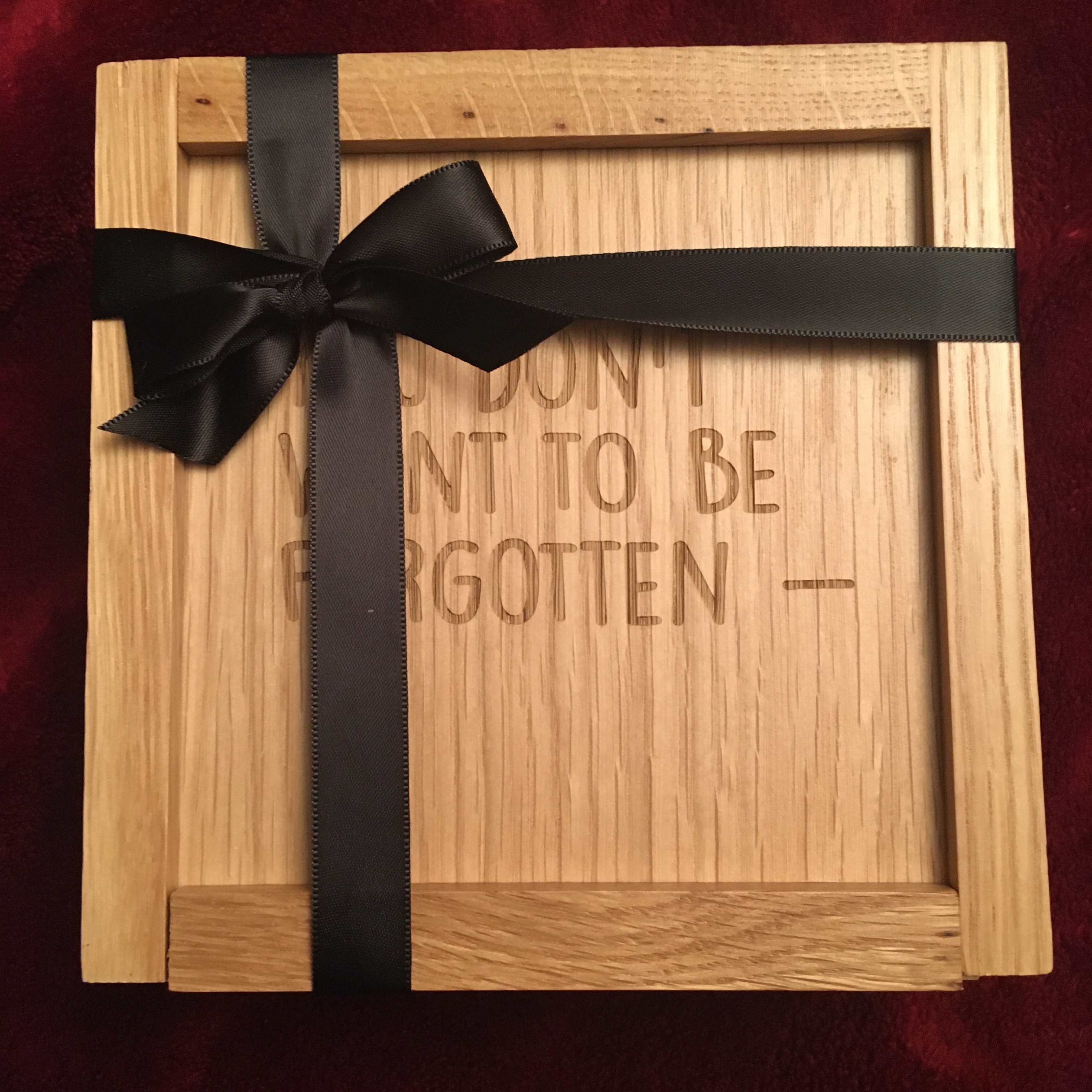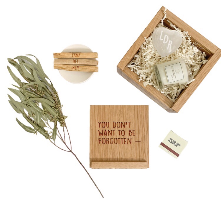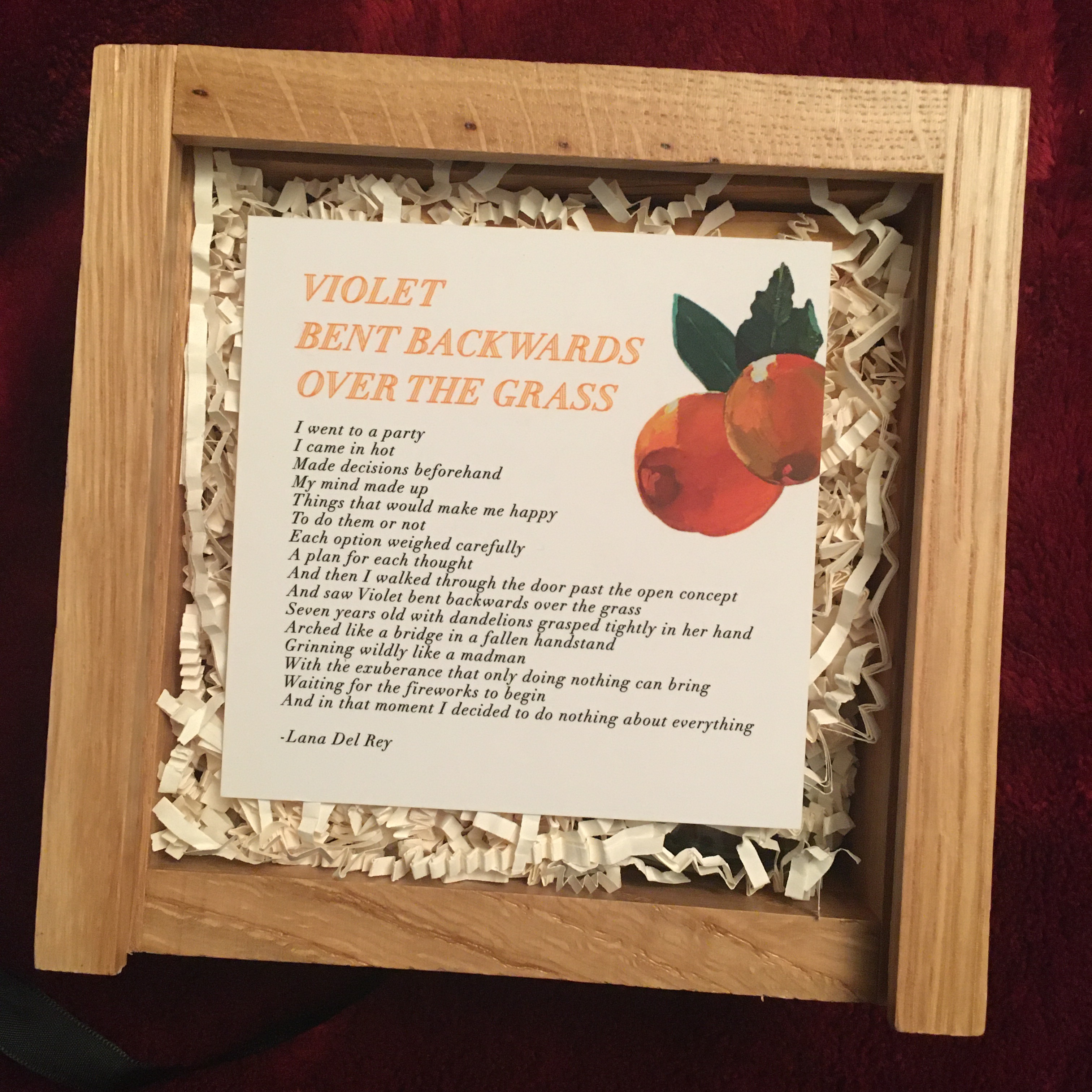 It includes a wooden box that says “You Don’t Want To Be Forgotten” on the top, and “You Just Want To Disappear” on the bottom of the lid. It came with a ribbon that wraps all the way around the box which is cool. There’s a card that was on the top that says “Violet Bent Backwards Over The Grass” which is named after a word-spoken poetry-type CD she released that I also have. There’s some cool writing or a poem of some sort on the card also that ends with ‘- Lana Del Rey’.