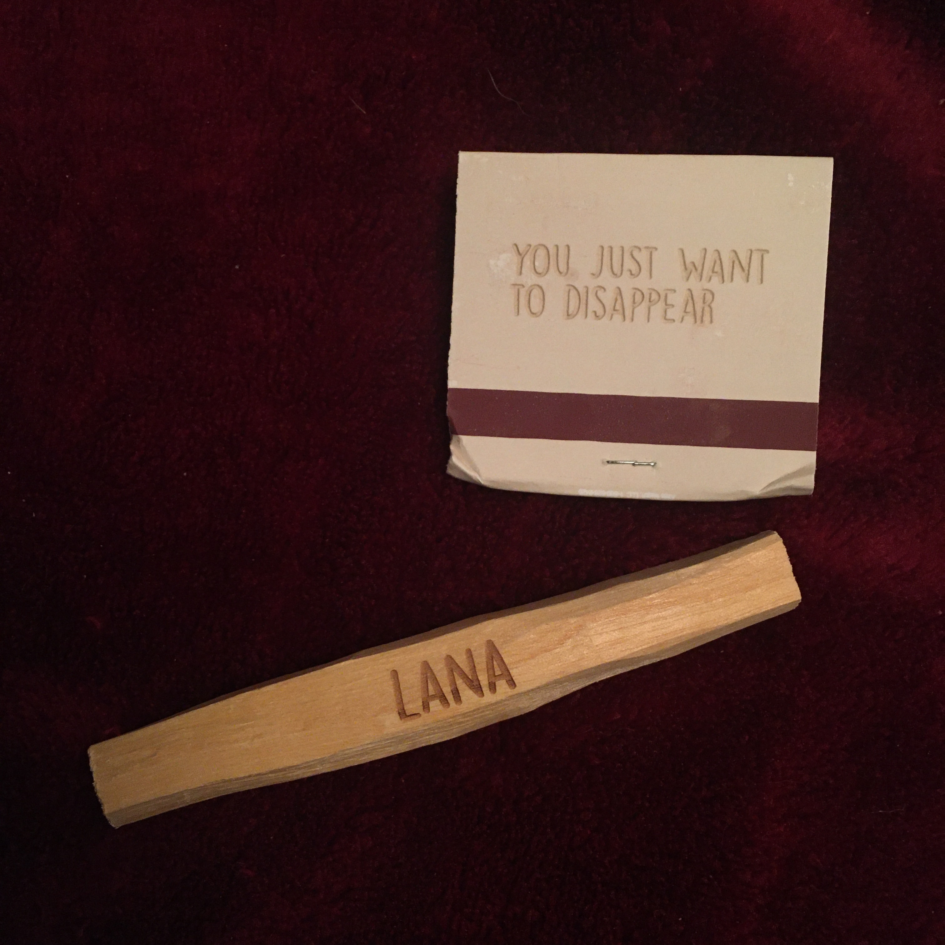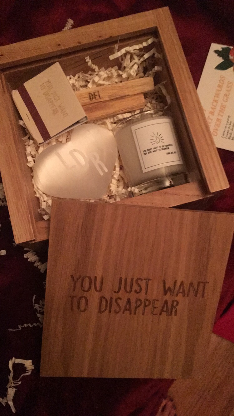 It then included a book of matches that says “You Just Want To Disappear” on it as well. I’ve used some of the matches to light the palo santo, but I’m saving them for now for the later sticks and etc. to burn later. The last two items are a small candle that says both of the two thing on it that were written on the top of the box, which is cute. And finally a stone of selenite that has “LDR” written on the top – selenite is a crystal of light and can charge other crystals, it’s really beautiful! That’d be it for everything in the box, thanks so much for checking out this blog post. I appreciate it a lot! I’ll also eventually blog more of what I have from Lana some day, that’ll be awesome too.
