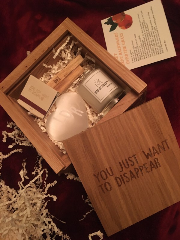 It then included a book of matches that says “You Just Want To Disappear” on it as well. I’ve used some of the matches to light the palo santo, but I’m saving them for now for the later sticks and etc. to burn later. The last two items are a small candle that says both of the two thing on it that were written on the top of the box, which is cute. And finally a stone of selenite that has “LDR” written on the top – selenite is a crystal of light and can charge other crystals, it’s really beautiful! That’d be it for everything in the box, thanks so much for checking out this blog post. I appreciate it a lot! I’ll also eventually blog more of what I have from Lana some day, that’ll be awesome too.