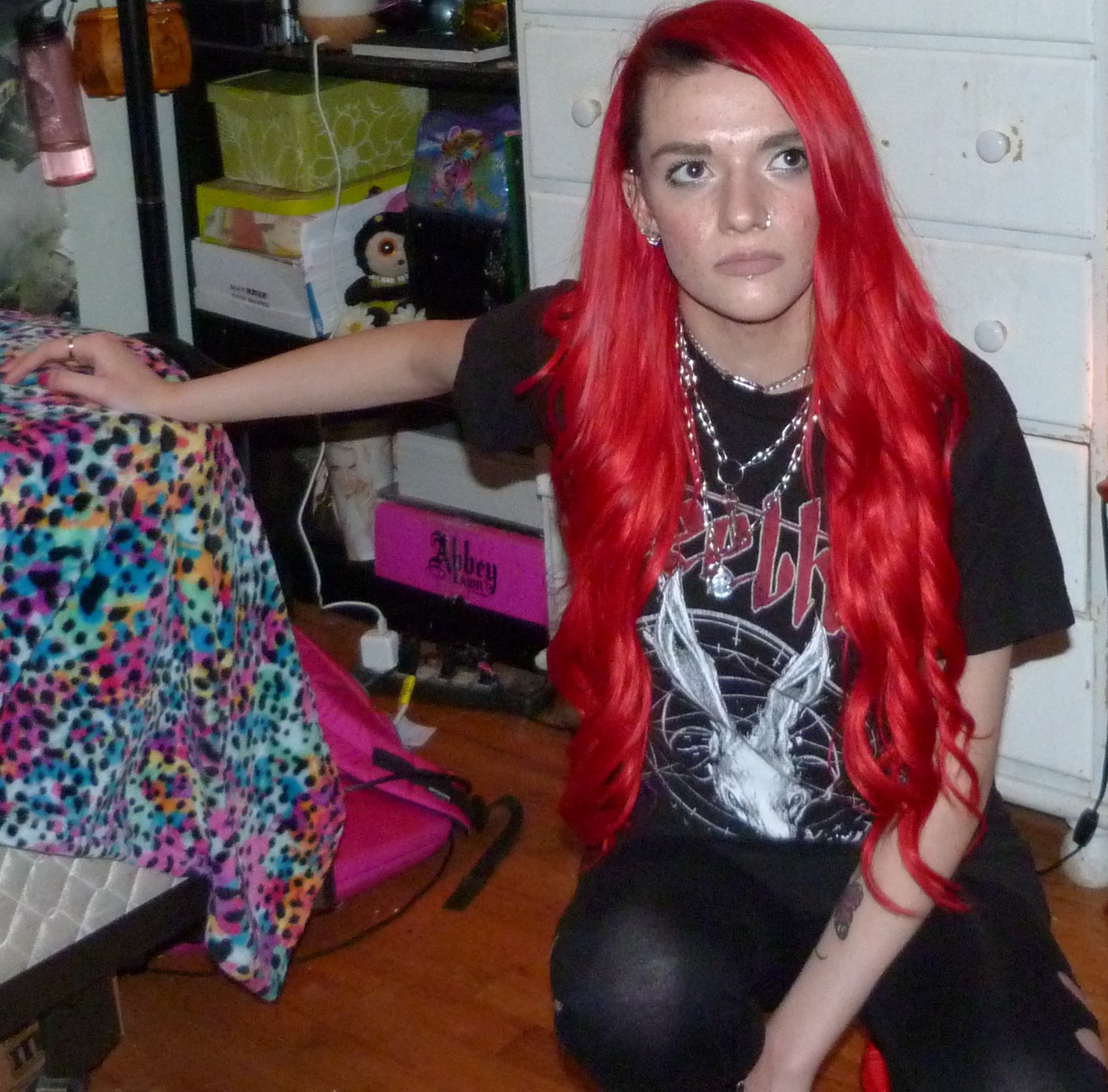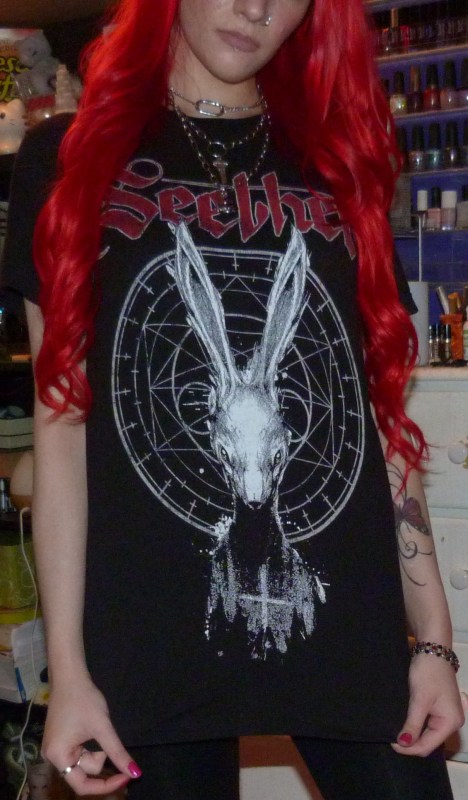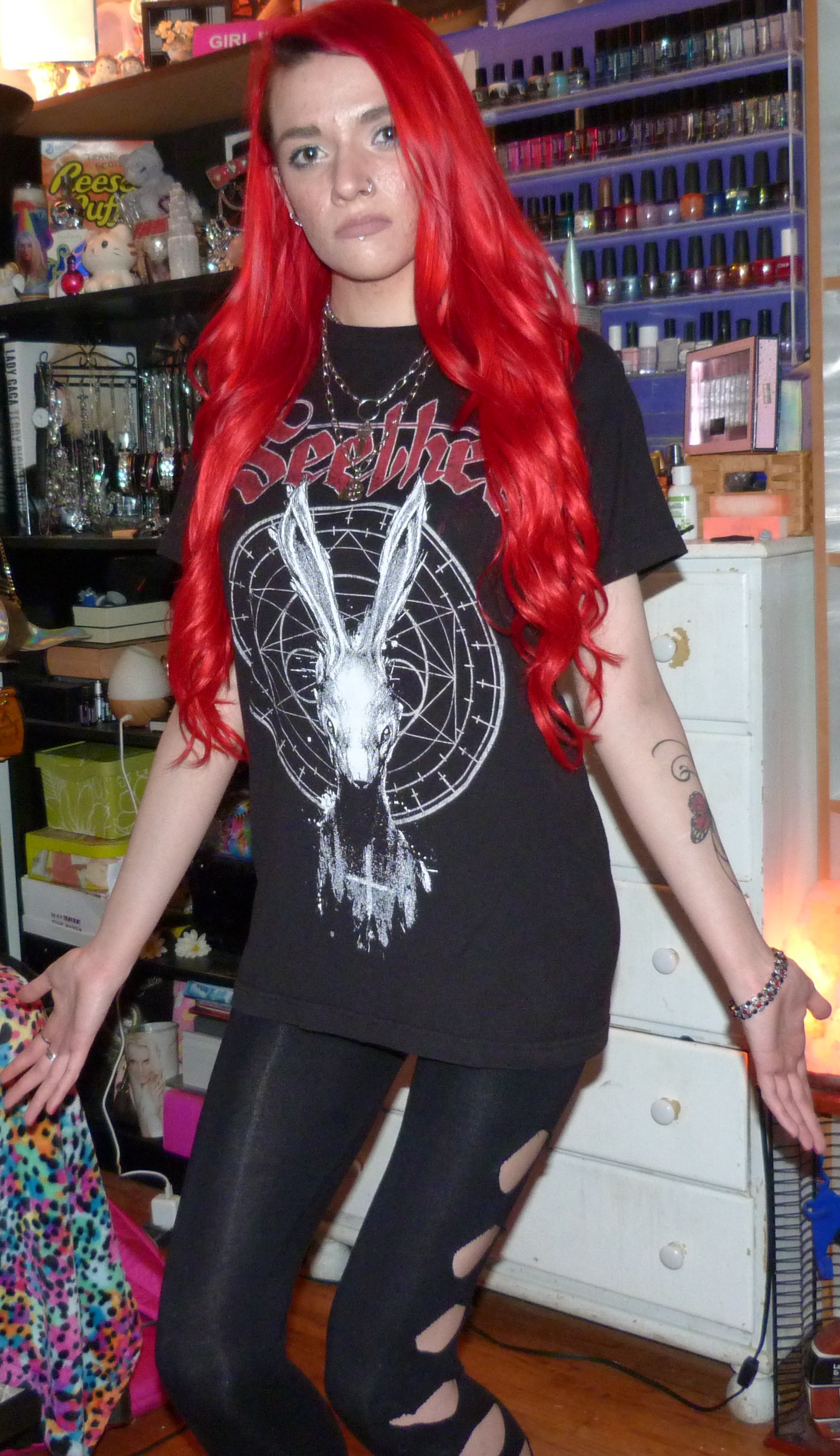 This shirt I’m excited that I finally did a photoshoot on recently, because it’s one of my favorites. After the first track on the album, I named this photoshoot Stoke the Fire and posted the full-thing on Shop For Days. I got this shirt on July 31st, 2018 at the Showbox SoDo in Seattle for the Poison the Parish Tour that was going on. I’ve had it since and finally did the photoshoot for it, after I got my hair dyed bright red again! I think it turned out really good, I wore my Bellami extensions for the blog photoshoot as well. I ended up wearing these same Boohoo cutout leggings and also these bright red ‘Can’t Hold Us Down’ booties from Nasty Gal, also from 2018! Lastly, my three-layered necklace with the key and lock are from Dolls Kill from 2021.