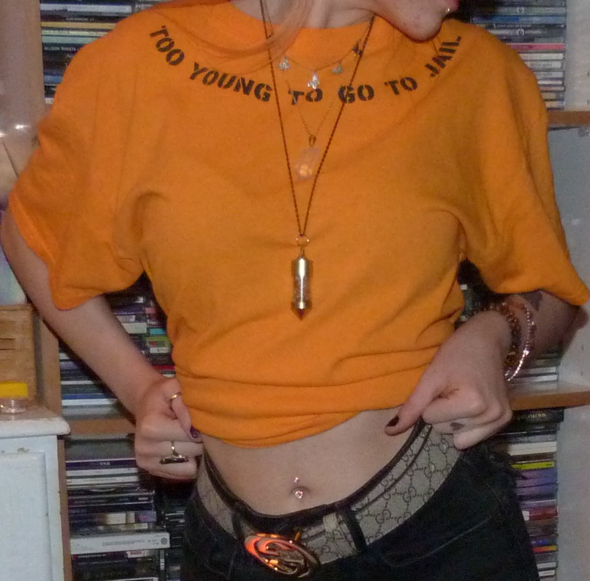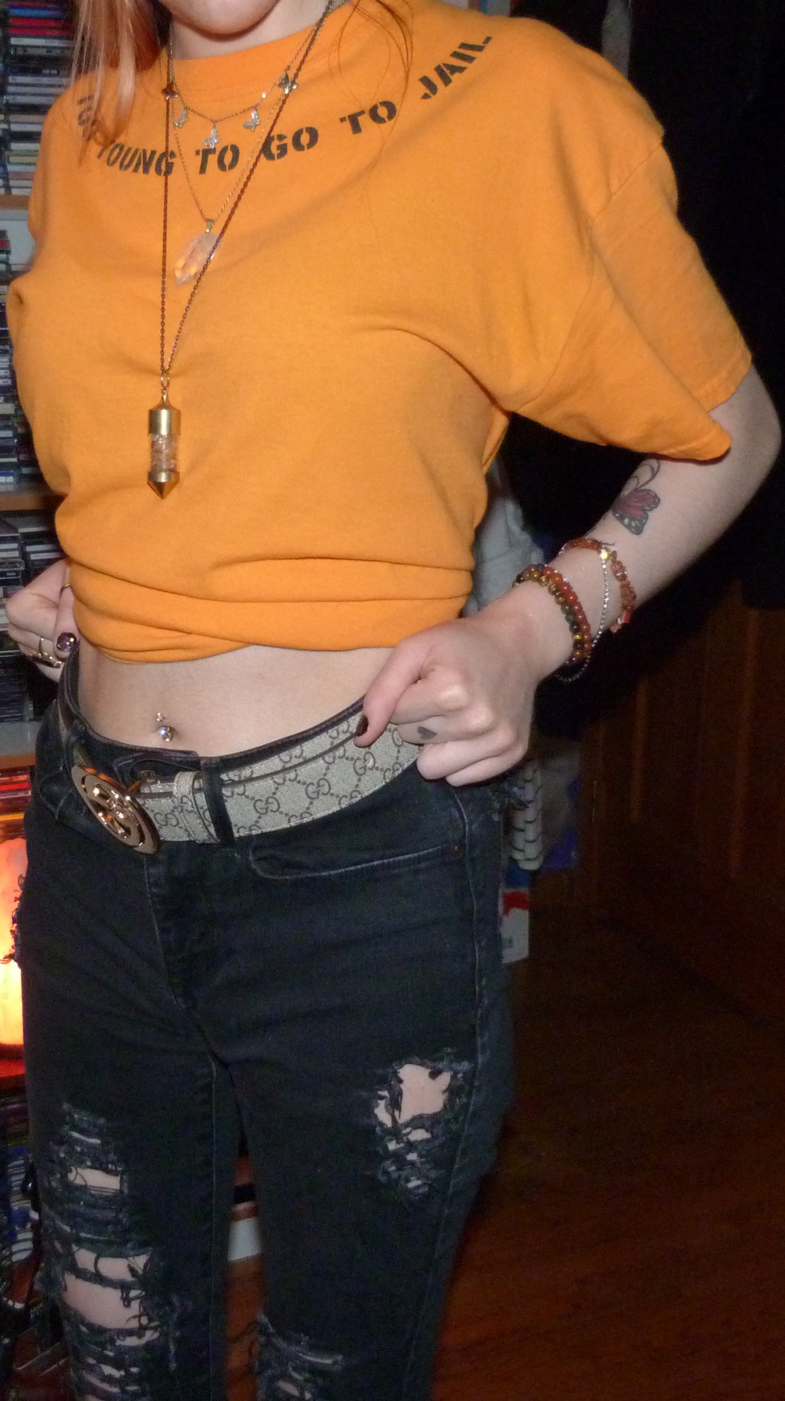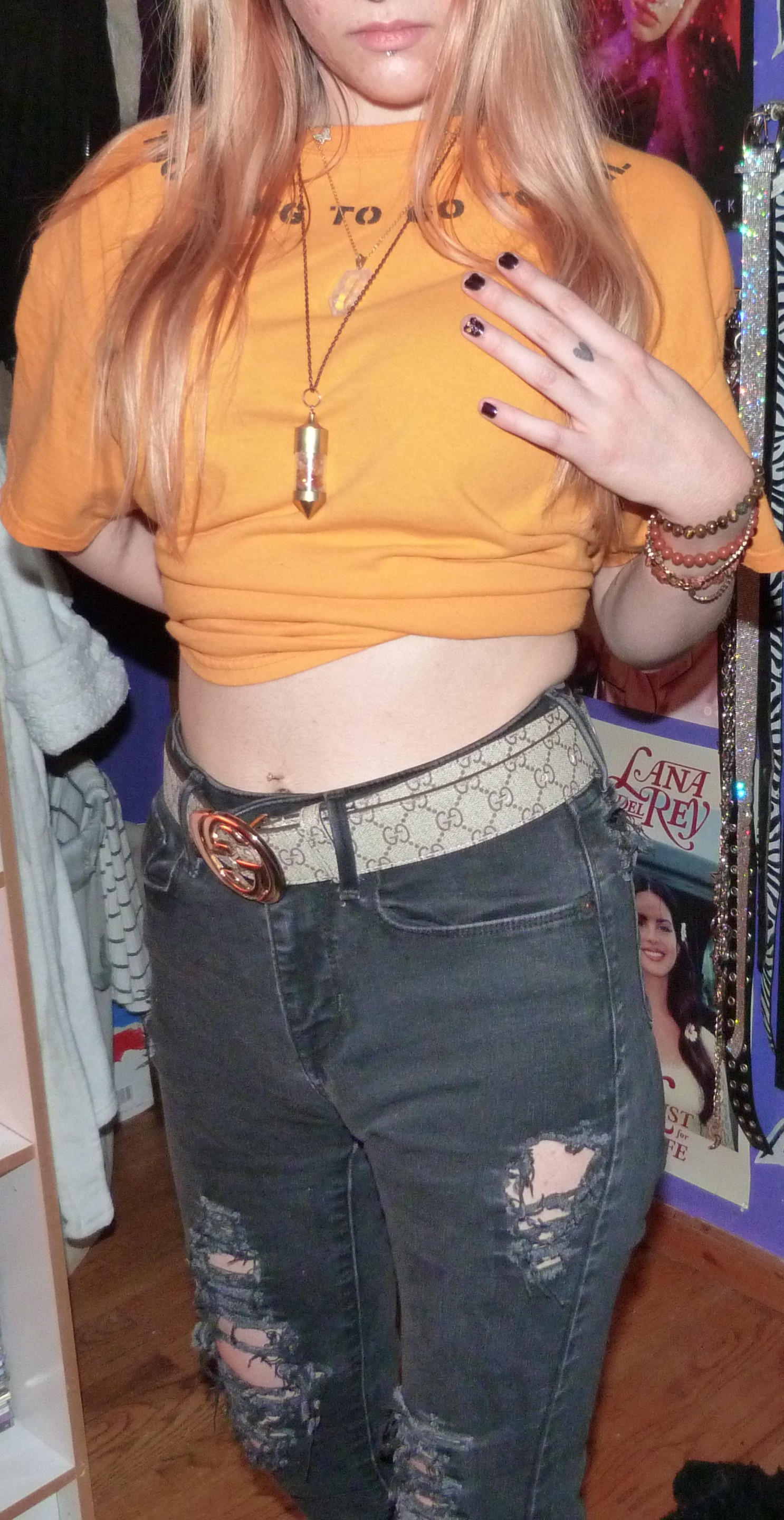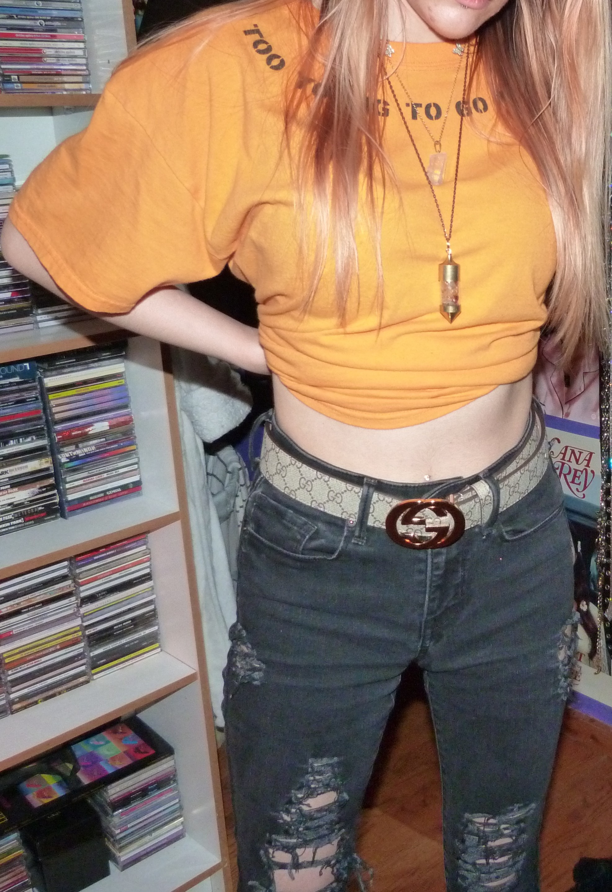 I recently did a cute photoshoot for this shirt that I got in 2018. This was the first Billie Eilish shirt I ever bought and I love it. It’s bright orange with the lyrics ‘Too Young To Go To Jail’ on the shirt from her song Bellyache. The photoshoot for it turned out pretty good! I wore it with gold & a Gucci belt that I got for Christmas. You can check the main blog post out on my main style/fashion blog, Shop For Days – it’s a post called GOLDWING named after a 2021 Billie song.