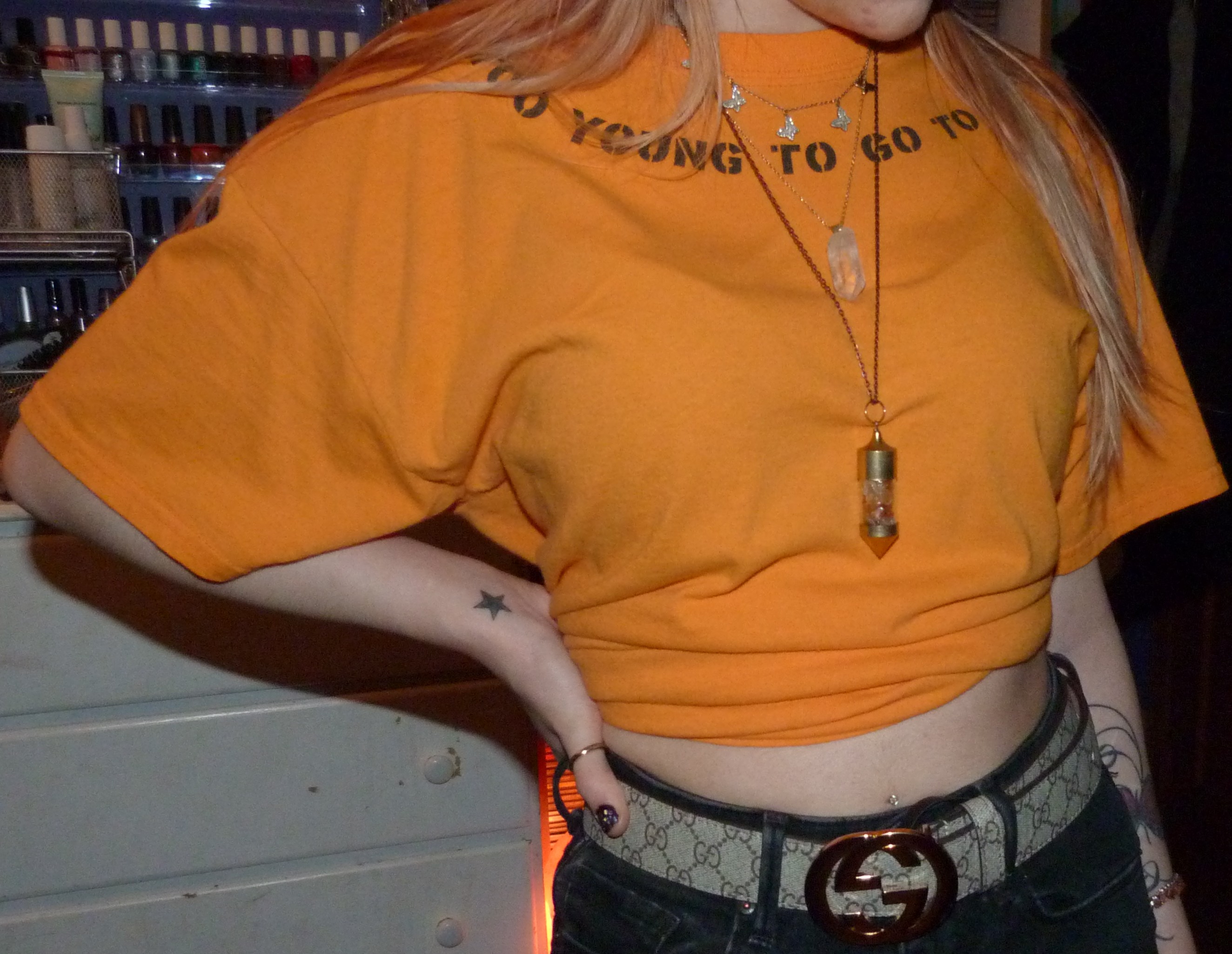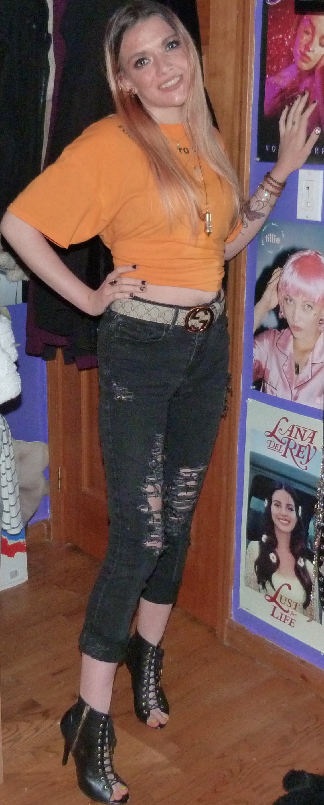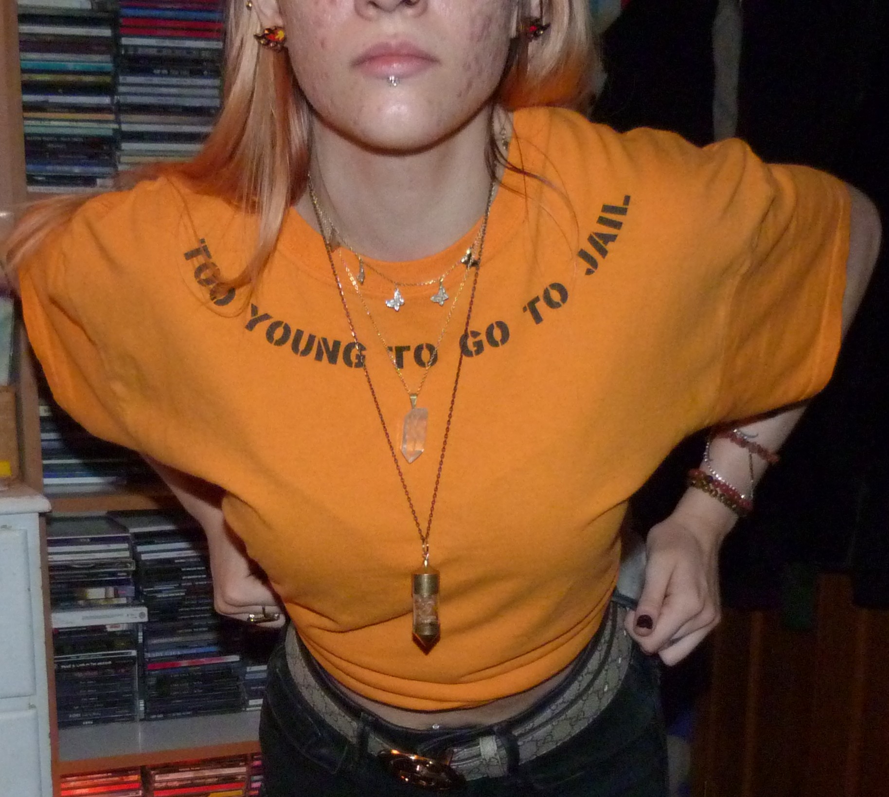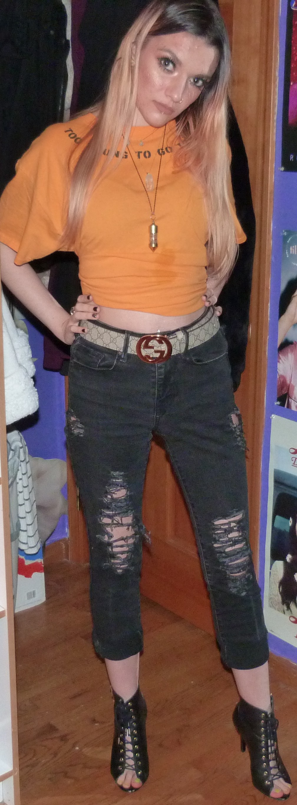 I recently did a cute photoshoot for this shirt that I got in 2018. This was the first Billie Eilish shirt I ever bought and I love it. It’s bright orange with the lyrics ‘Too Young To Go To Jail’ on the shirt from her song Bellyache. The photoshoot for it turned out pretty good! I wore it with gold & a Gucci belt that I got for Christmas. You can check the main blog post out on my main style/fashion blog, Shop For Days – it’s a post called GOLDWING named after a 2021 Billie song.