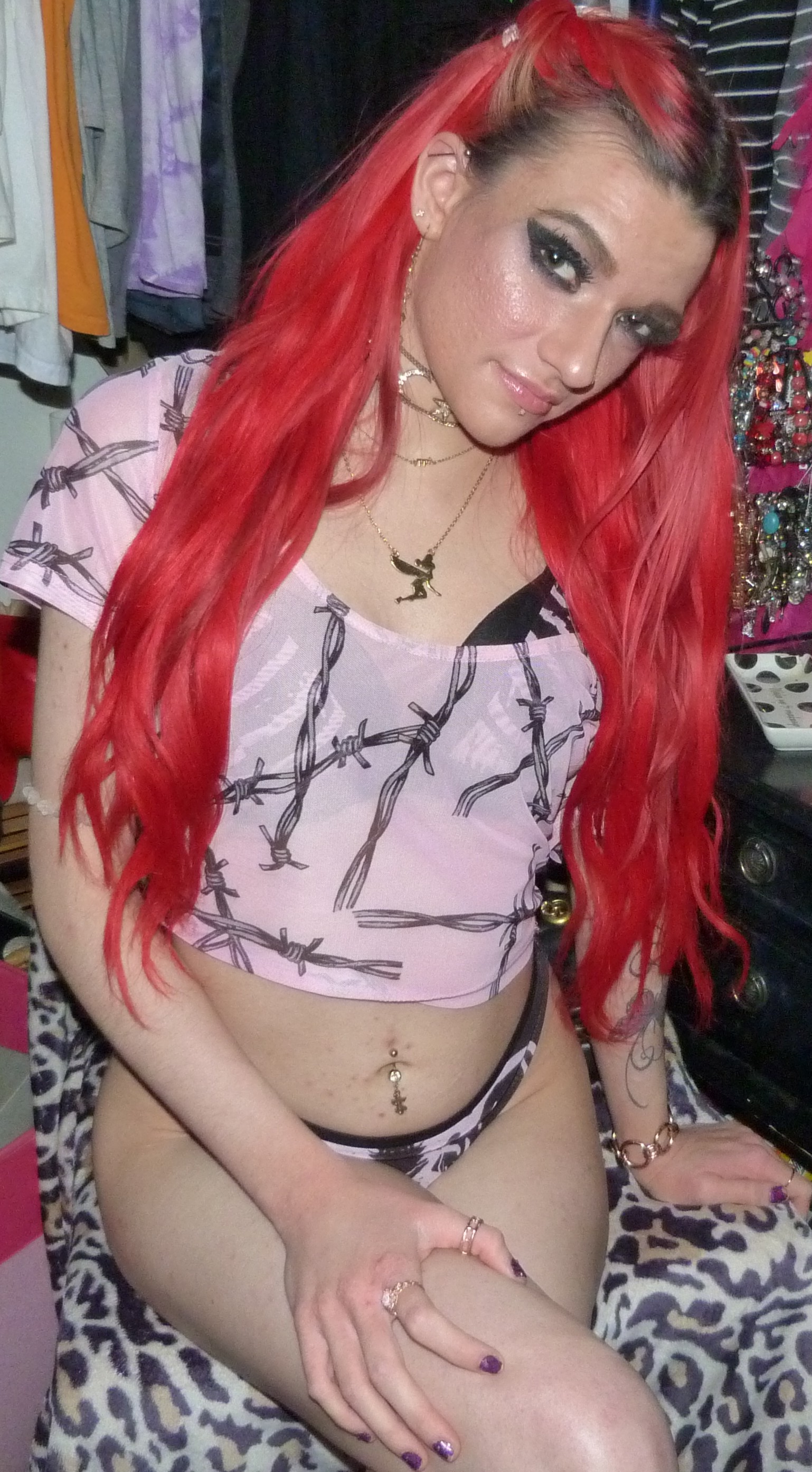 Hey guys! Today I have x3 more items from one of the Avril Lavigne x Killstar collections there were, from the first drop they did in 2022. It was a bunch of sheer pink & black things which was pretty cool. I got the sheer pink barbed wire crop top of theirs called the Encrypted Crop Top, which I wore with this bra set & then also of course the Strummin Bra & Strummin Panty which is this sheer skeleton bra set that I wore with it! I took pictures of the three together as an outfit & then pictures of the bralette set by itself. It turned out pretty good! I loved Avril for doing the three collections that she did, I have x8 things total from her collaborations with them.
