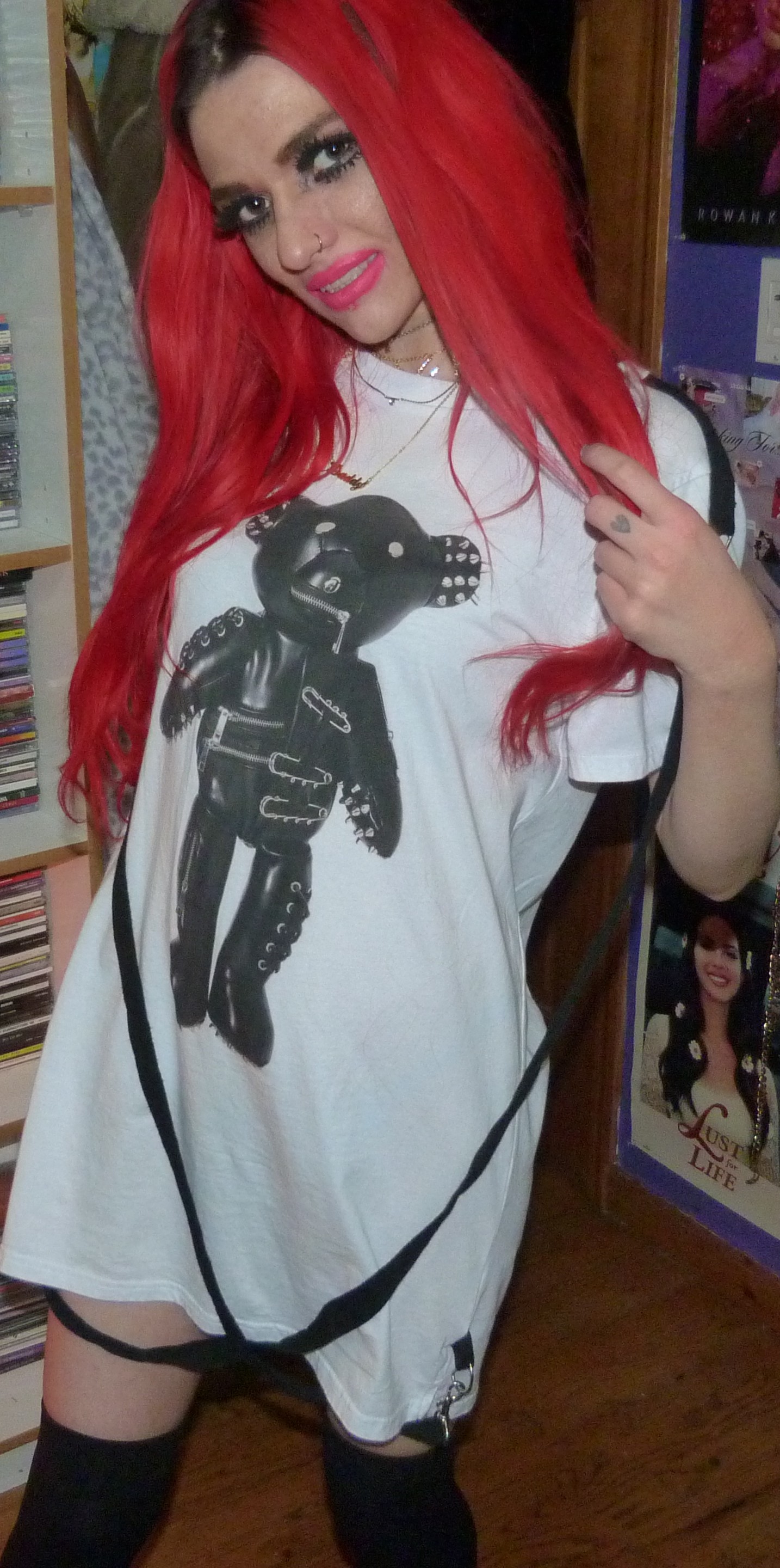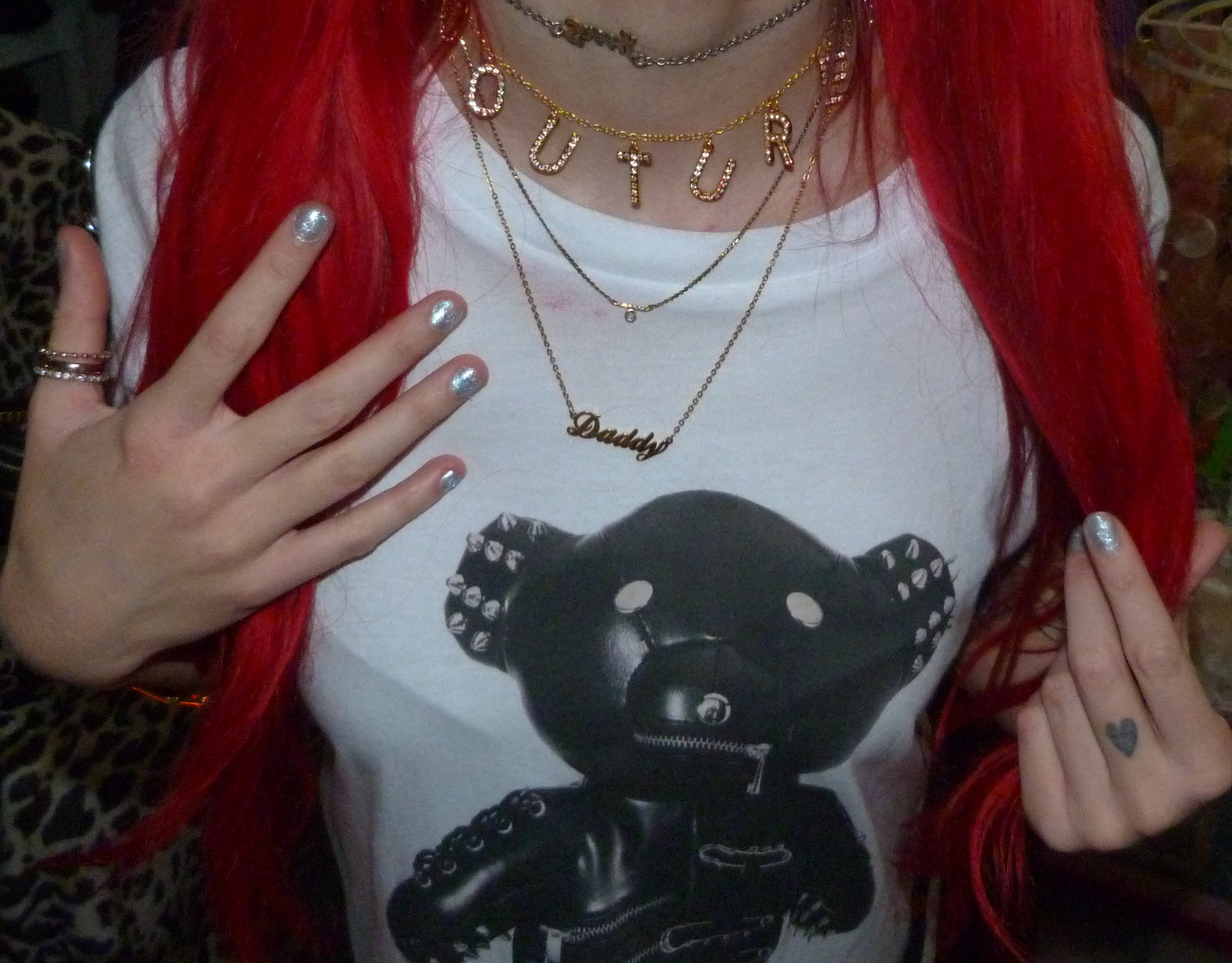 New gold necklace that I just finally got from St. Vincent’s online merch store! Finally I got this like 2021 gold ‘Daddy’ necklace that I’ve been really wanting, from her 2021 Daddy’s Home album! It’s such a pretty gold necklace & it even comes with it’s own dust bag that says ‘Daddy’s Home’ on it, like that song which is a really good song! I love St. Vincent, she just dropped another album but I really wanted this necklace finally! I got it like this month basically & shot it in my TORMENTED? TEDDY. photoshoot up on my main blog, Shop For Days this month! You can check out that full photoshoot & blog with those links! For now, here’s a collage for the necklace.